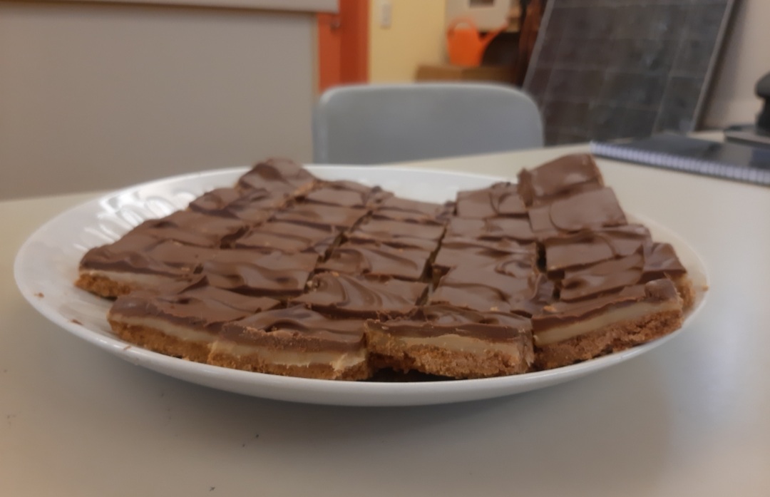 Die dritte Teilnehmerin, Rachel (PL3), wagte sich an einen No-Bake Millionärschnitten-Kuchen. Sie vermischte Butter mit Kekskrümeln und formte daraus einen festen Boden. Mit einer glatten Schicht Karamell und Sckokolade, verwandelte sie diesen Kuchen in eine wahre Geschmacksexplosion, ohne auch nur den Backofen zu berühren.