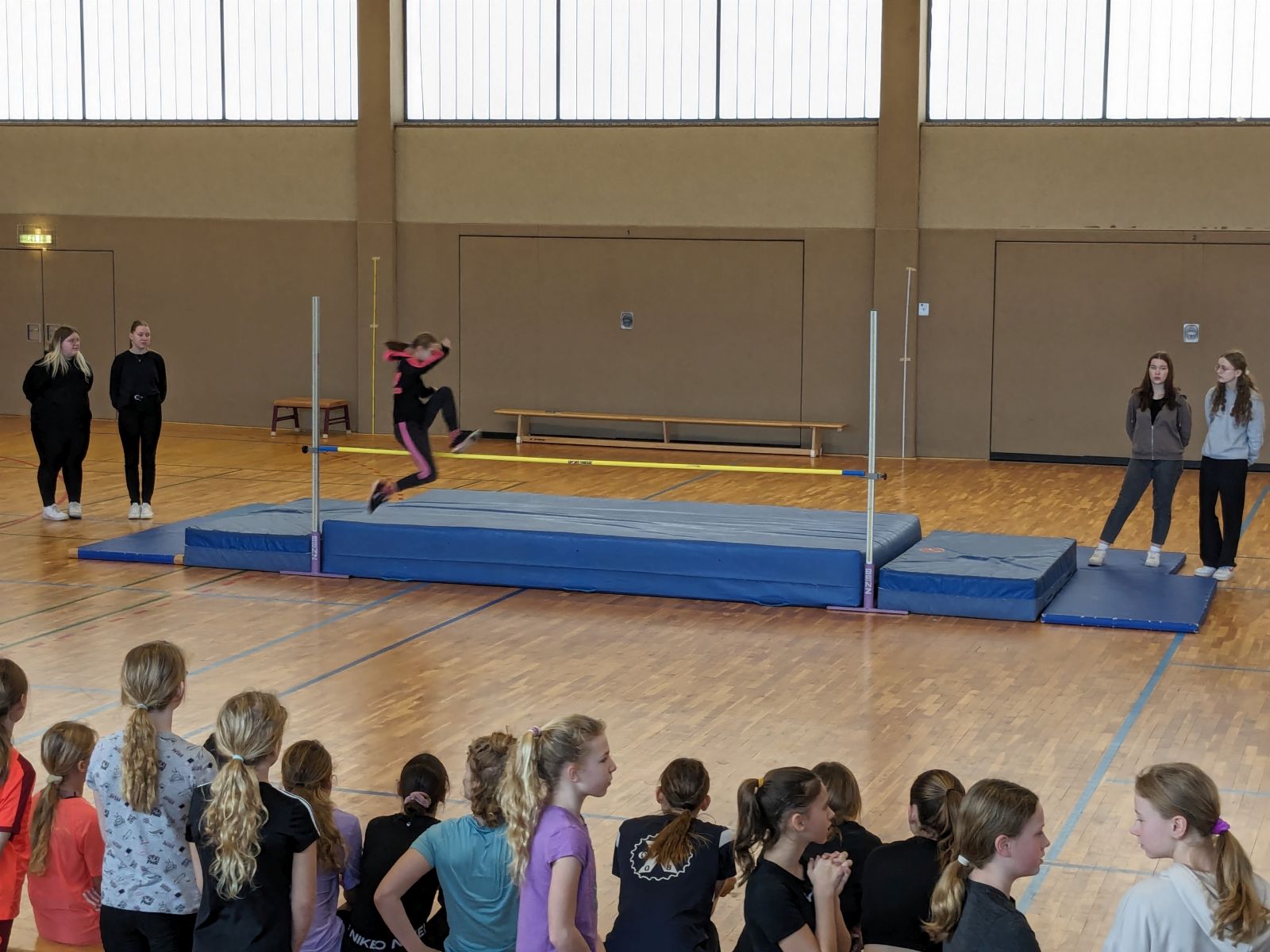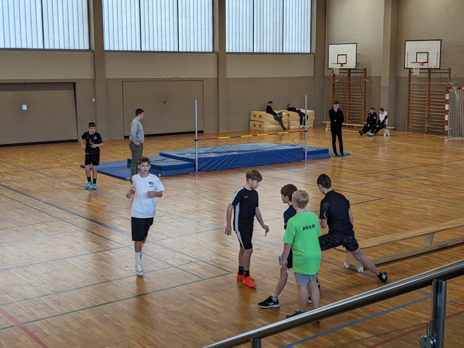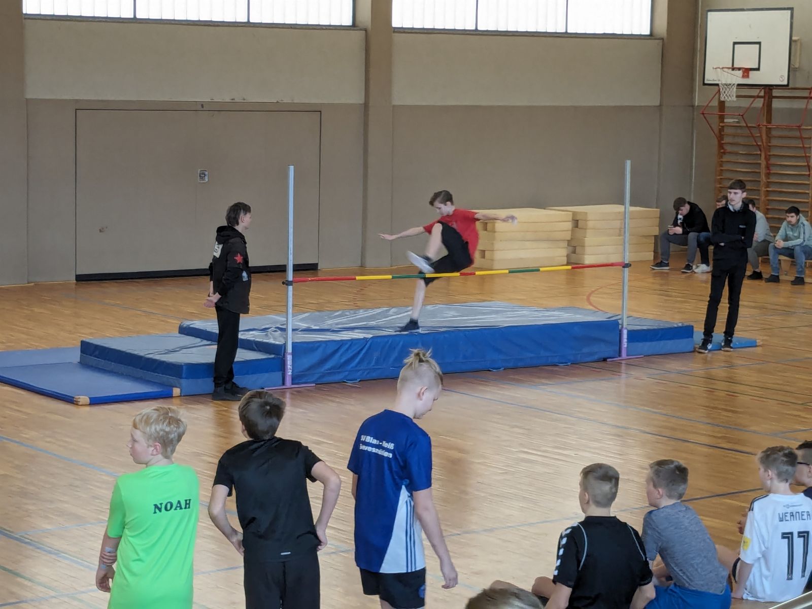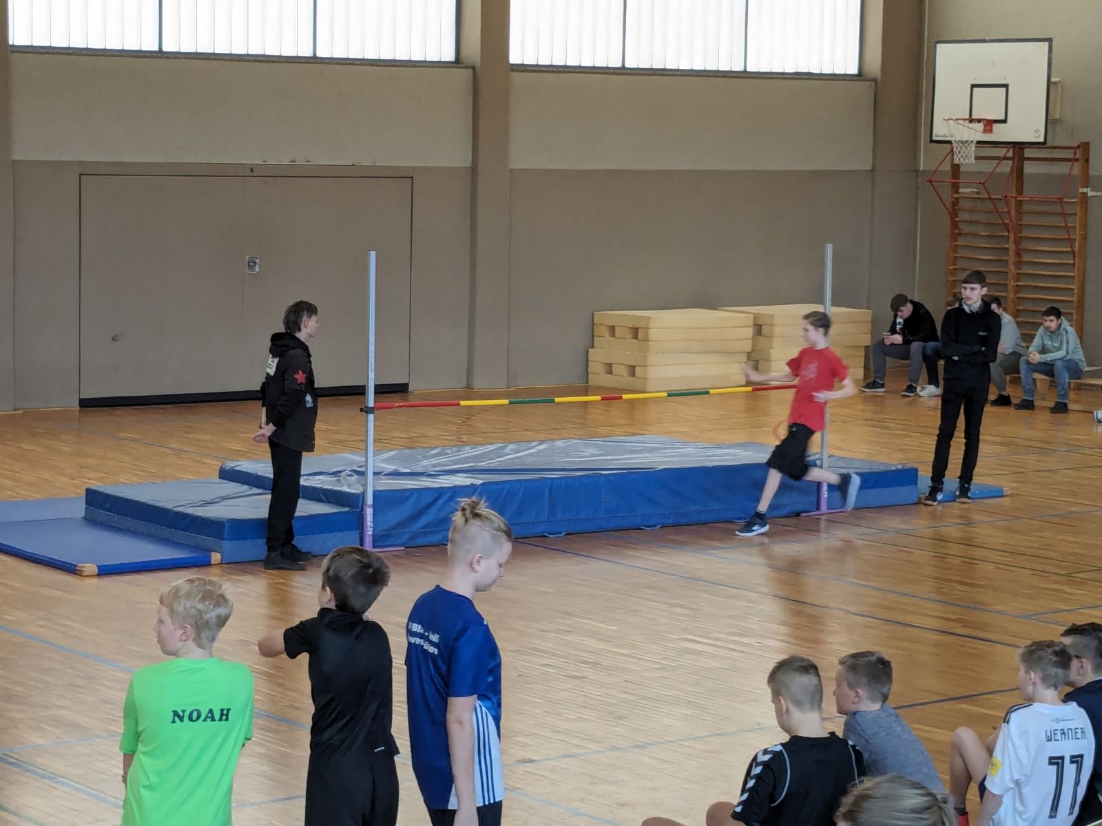 Einige dutzend Schülerinnen und Schüler der Klassenstufen 5. bis 10. erreichten dieses Ziel und heute war dann der große Tag. Während sich auf der Tribüne schon die Zuschauer sammelten, musste von jedem Teilnehmer die Größe gemessen werden. Nur so konnte fair ermittelt werden, wer gemessen an seiner Körperlänge den höchsten Sprung geschafft hat.