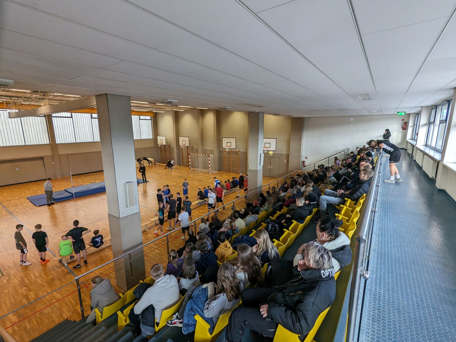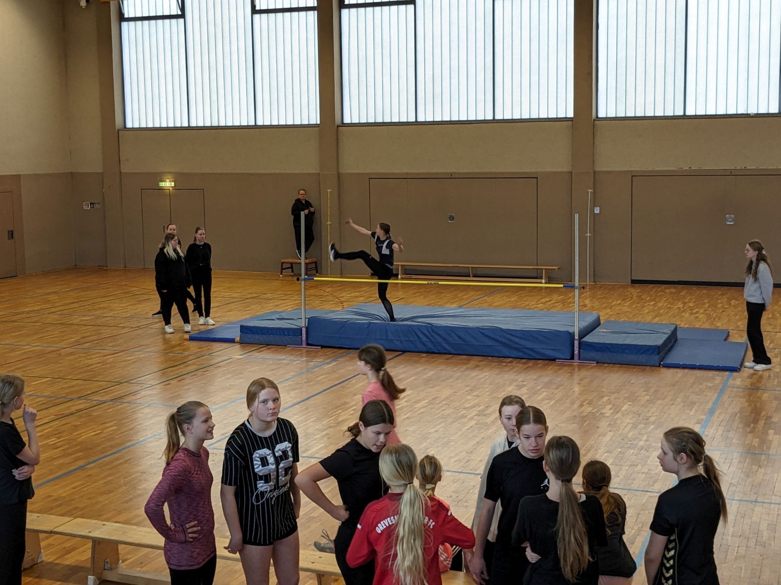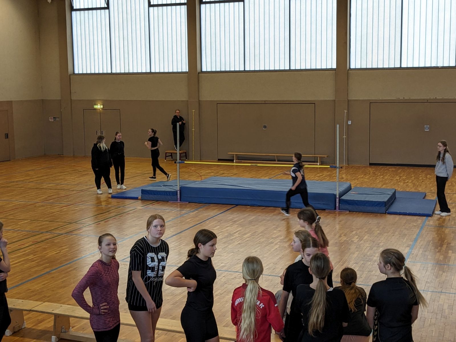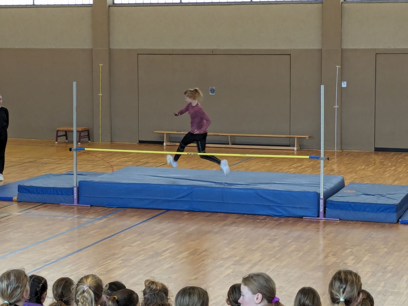 Einige dutzend Schülerinnen und Schüler der Klassenstufen 5. bis 10. erreichten dieses Ziel und heute war dann der große Tag. Während sich auf der Tribüne schon die Zuschauer sammelten, musste von jedem Teilnehmer die Größe gemessen werden. Nur so konnte fair ermittelt werden, wer gemessen an seiner Körperlänge den höchsten Sprung geschafft hat.