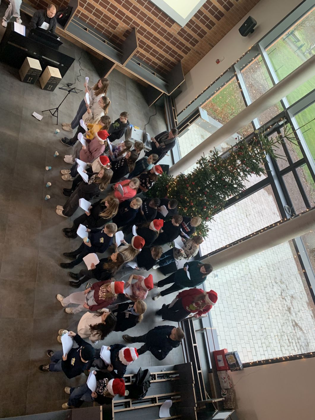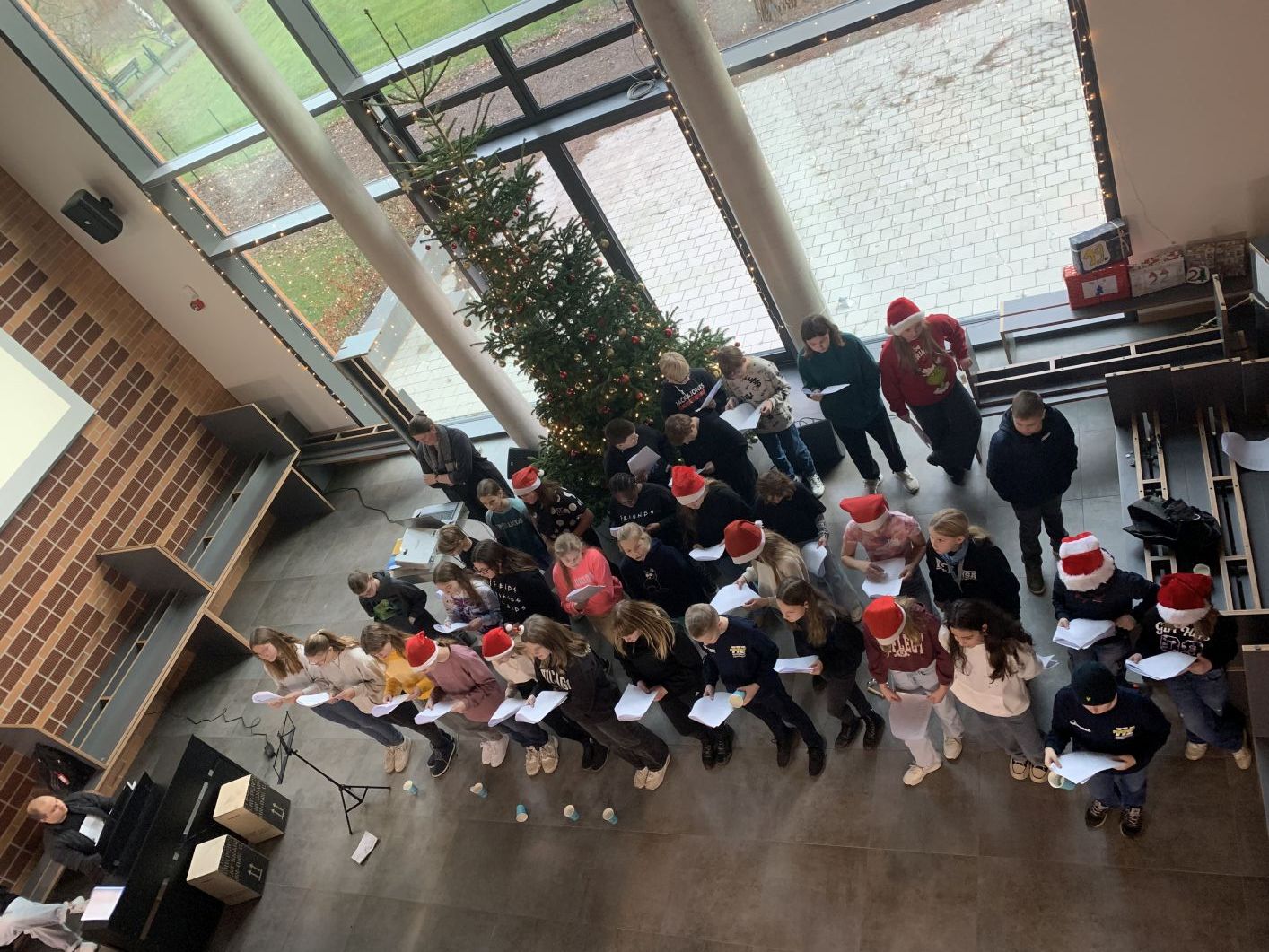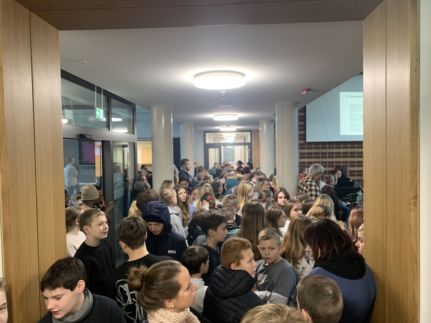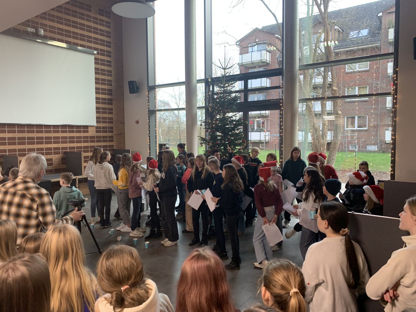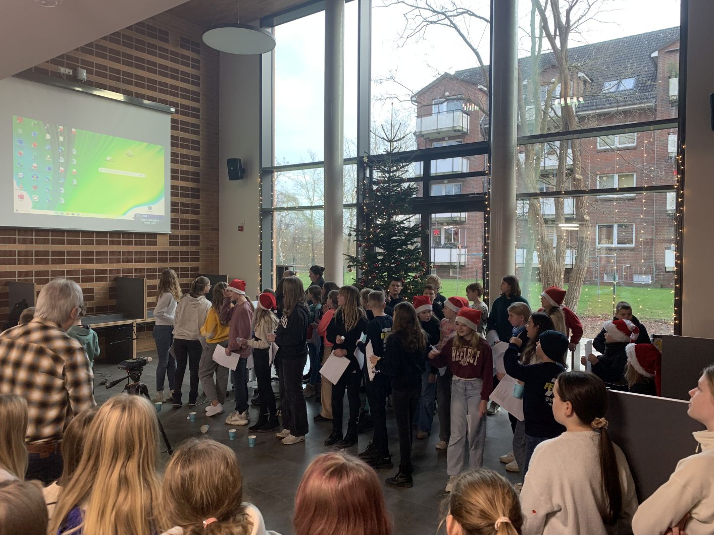 Am Mittwoch präsentierte ein Chor aus Schülerinnen und Schülern der 5. und 6. Klassen unter der Leitung von Herrn Iliev ein stimmungsvolles Weihnachtskonzert. Neben Klassikern der Weihnachtsmusik schallte auch "Last Christmas" in einer Karaokeversion im Atrium, bei der viele begeistert mitsangen. Einige Schülerinnen und Schüler ließen sich von der ausgelassenen Stimmung anstecken, während es anderen schwerfiel, die Konzentration und den Respekt für die vollen 30 Minuten beizubehalten.