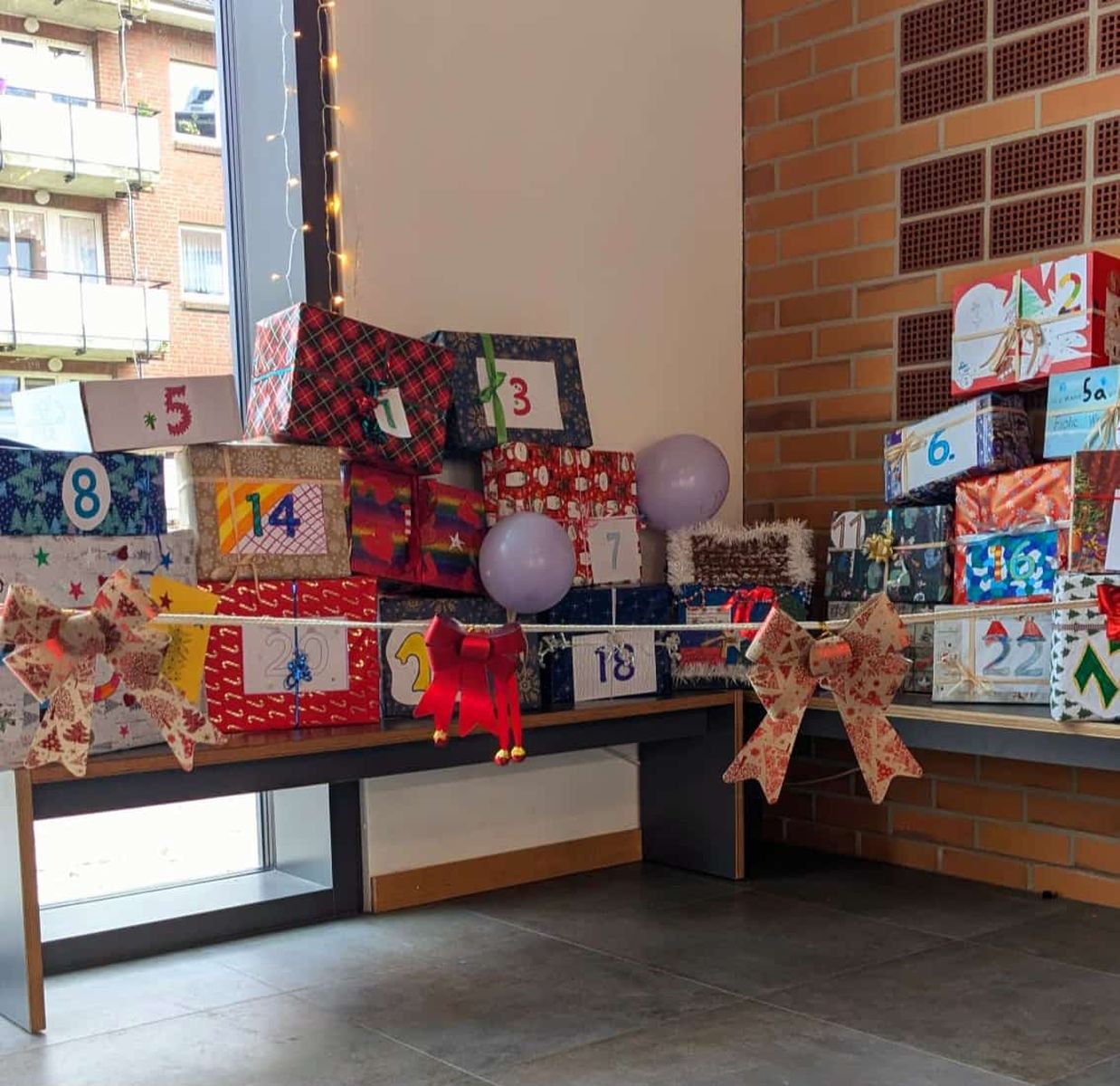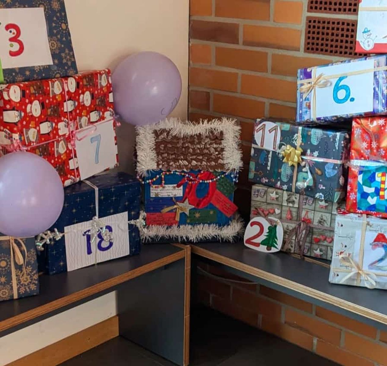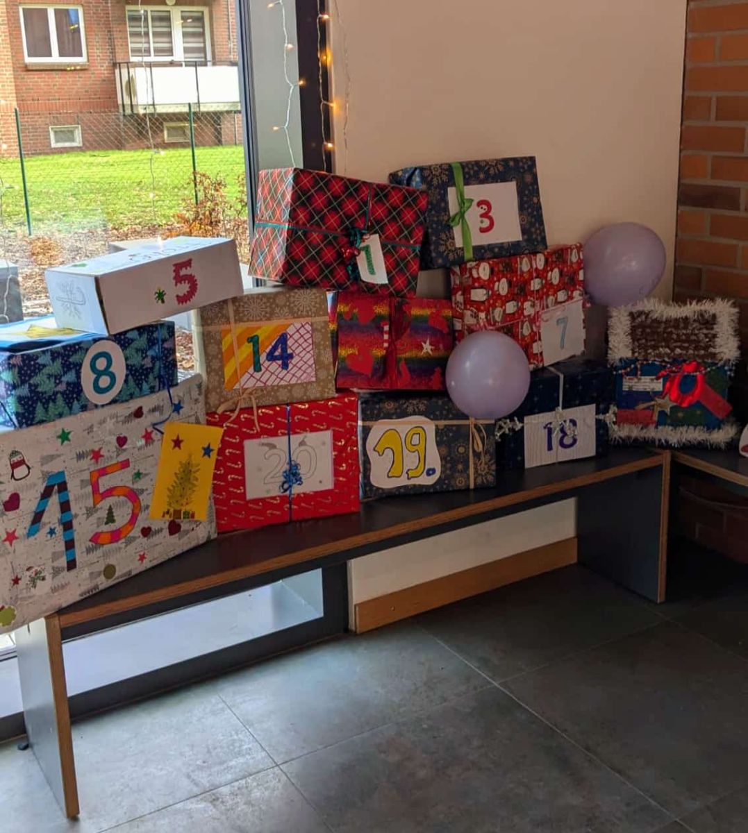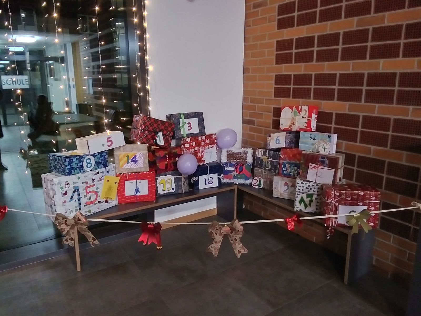Um die Zeit bis dahin weihnachtlich zu gestalten, hat das Kollegium immer wieder Ideen umgesetzt. Ein schon länger vorbereitetes Highlight ist der Adventskalender wo jede Klasse einer anderen Klasse ein "Türchen" geschenkt hat. Es gab Kuchenbasargutscheine, gemeinsame Zeit in den Klassen, Süßigkeiten und vieles mehr. Die Schüler haben die Ideen selbst entwickelt und auch die Kartons mit den Präsenten gestaltet.