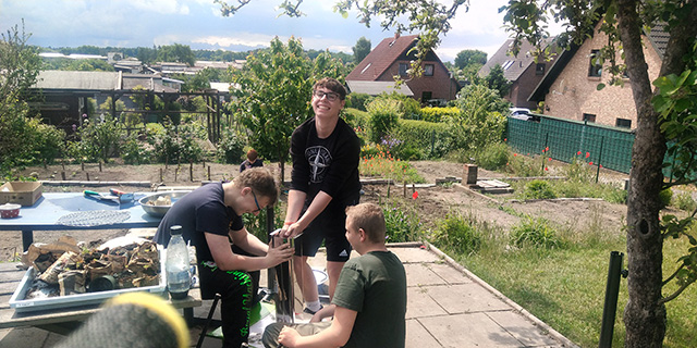 Mehrere Stunden die Woche kümmern sich Schüler und Schülerinnen liebevoll um den Schulgarten. Es wird gebuddelt, gejätet, gemulcht, gemäht, gesät, gebaut, gewässert und vieles mehr – aber vor allem Dingen gelernt, gelacht und geflucht. Die Heranwachsenden freuen sich über die Verknüpfung körperlicher Arbeit mit Theoriestunden und Unterweisungen im Garten und dass sie (meistens) die Sonne genießen können.